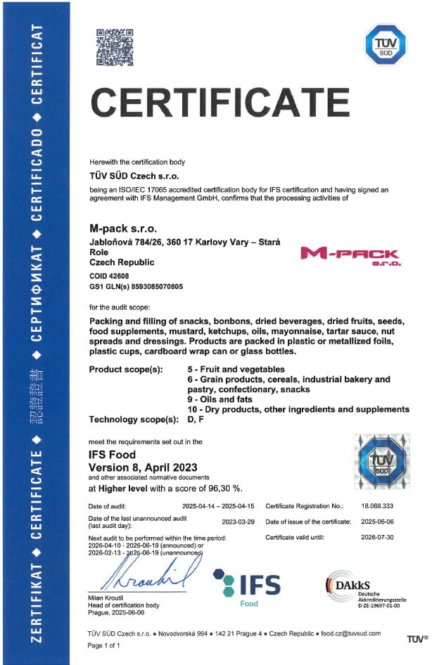 Das Zertifikat bestätigt die Übereinstimmung mit dem internationalen Standard IFS Food mit einer Bewertung von 96,3 %. Es bezieht sich auf Tätigkeiten im Zusammenhang mit der Verpackung und Abfüllung verschiedener Lebensmittel und belegt das hohe Niveau von Sicherheit und Qualität unserer Prozesse.