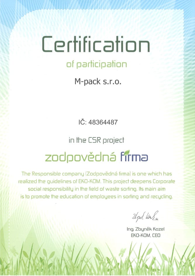 Unser Unternehmen ist dem System EKO-KOM angeschlossen und erfüllt damit die gesetzlichen Verpflichtungen im Bereich der Rücknahme und des Recyclings von Verpackungen. Wir leisten einen aktiven Beitrag zum Umweltschutz und zur Unterstützung der Abfalltrennung und -verwertung in der Tschechischen Republik.