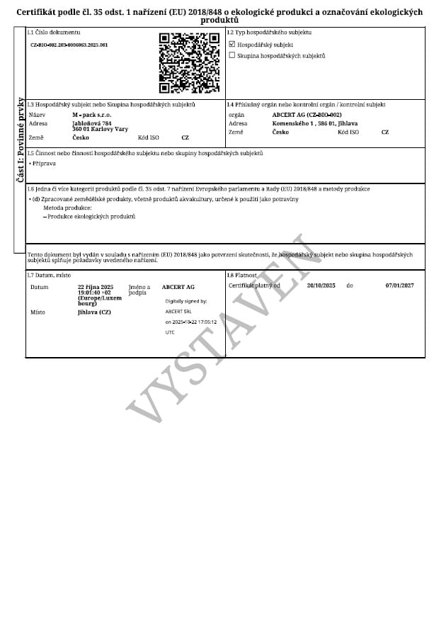 We hold a certificate pursuant to Article 35(1) of Regulation (EU) 2018/848, confirming that we meet the requirements for organic production and labelling of organic products in accordance with European Union legislation.